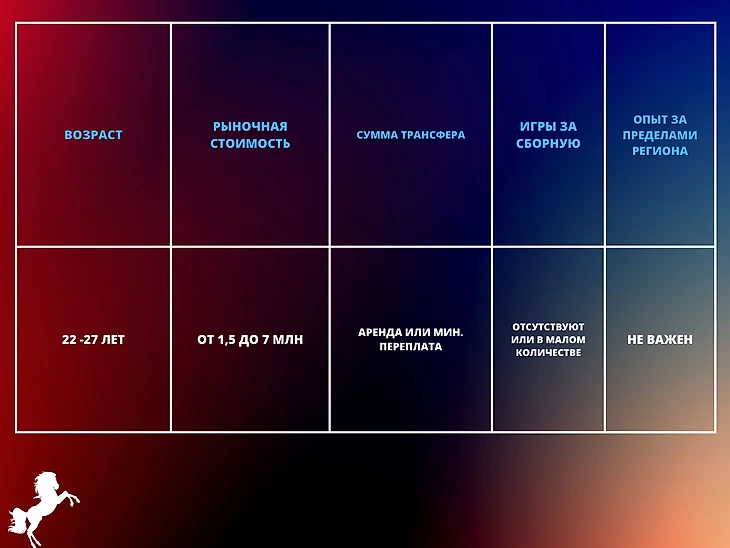 С возрастом все ясно, по стоимости большой разброс, но примеры Языджи и Гбамена показательны. Игрок может иметь большую трансферную стоимость, но потерял место в составе команды и готов к новым вызовам. Таких футболистов рассматриваем в аренду, с меньшей стоимостью - никаких переплат. Страна клуба и игрока неважны. При этом не забываем, что в нынешней ситуации есть клубы и игроки, с которыми будет трудно договориться.