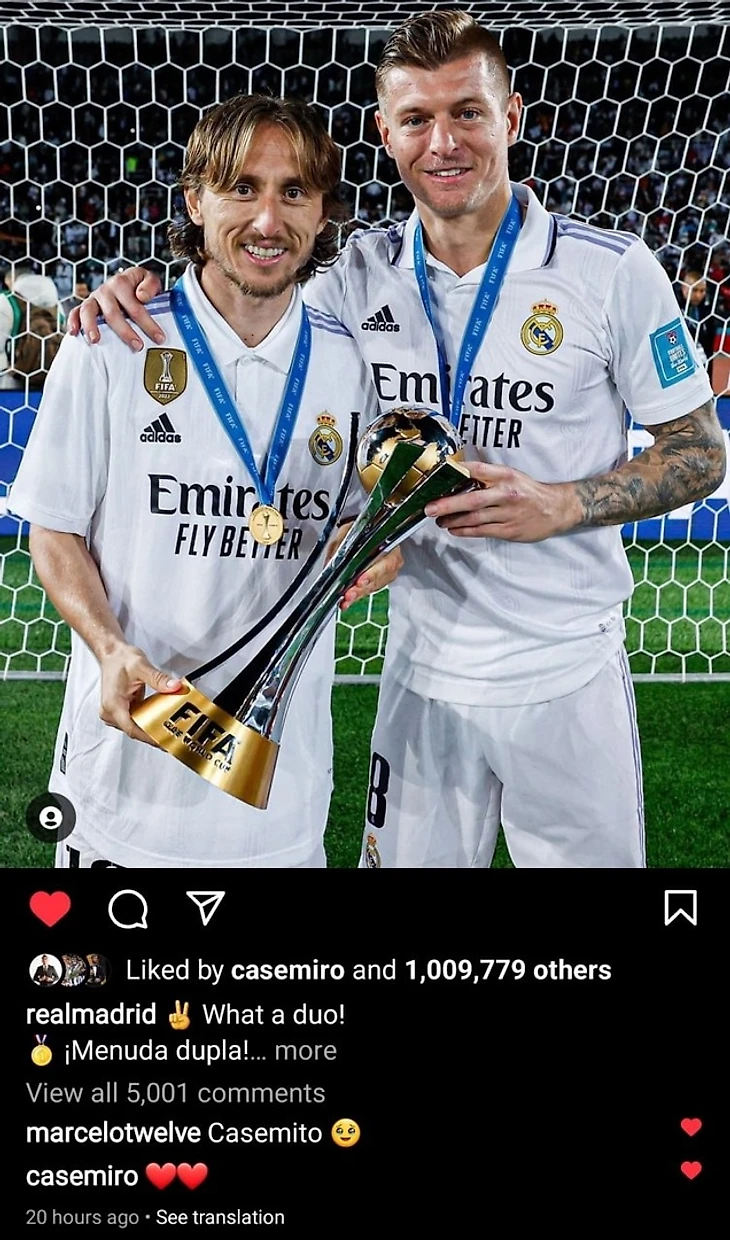 «Реал Мадрид» в социальных сетях поделился фотографией новоиспеченных клубных чемпионов мира – Тони Крооса и Луки Модрича. В составе команды Карло Анчелотти, они обыграли «Аль-Хилаль» (5:3).