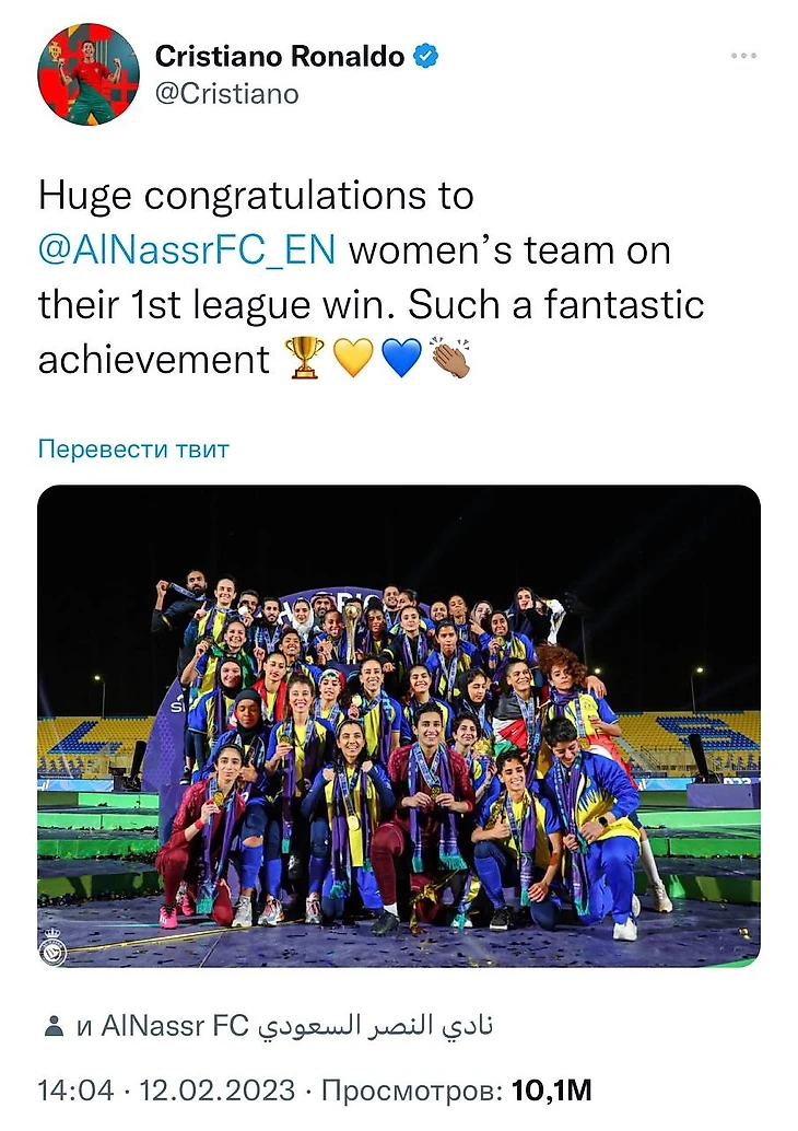 «Мои искренние поздравления женской команде «Аль-Наср» с их первой победой в чемпионате. Такое фантастическое достижение 🏆💛💙👏🏽», – написал 38-летний португалец в соцсетях.