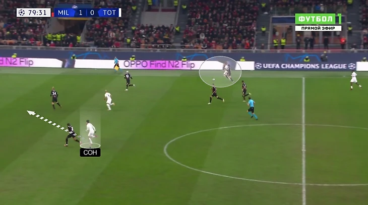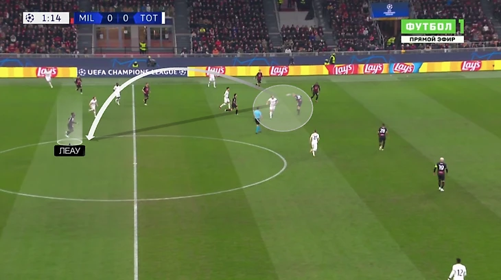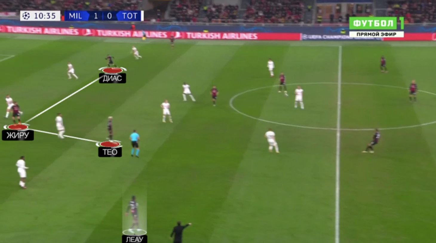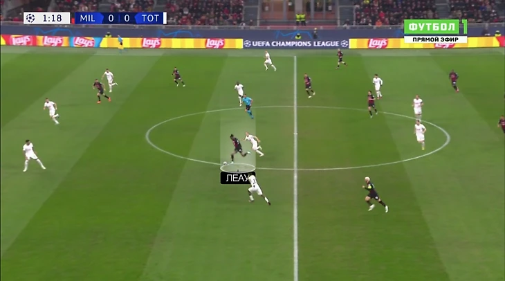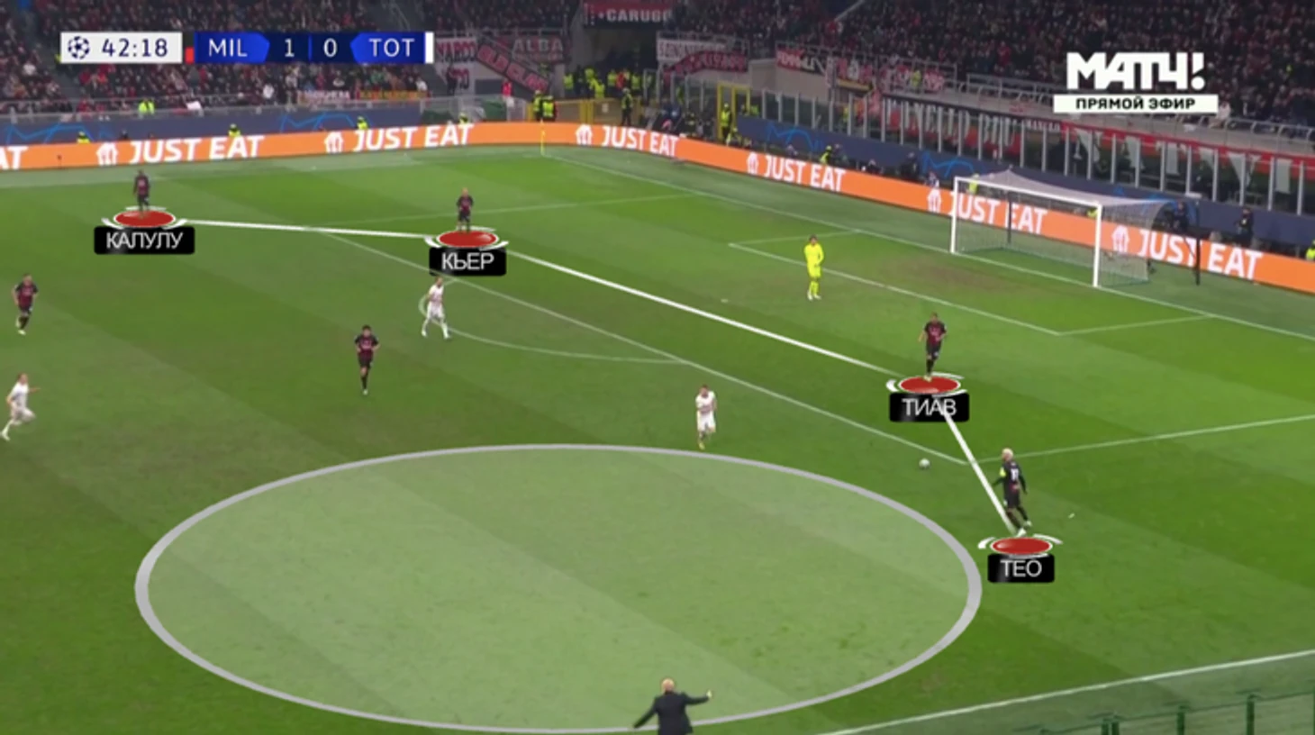 Когда «Тоттенхэм» прессинговал, «Милан» перестраивался с пятерки на четверку защитников. Тео специально оставался ниже Алексиса Салемакерса – помогал за счет техники с выходом в атаку: