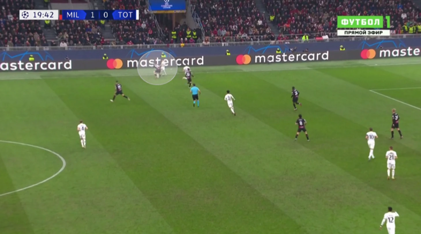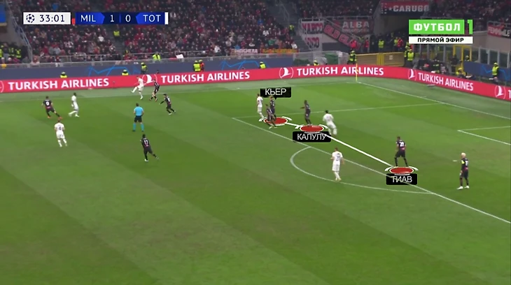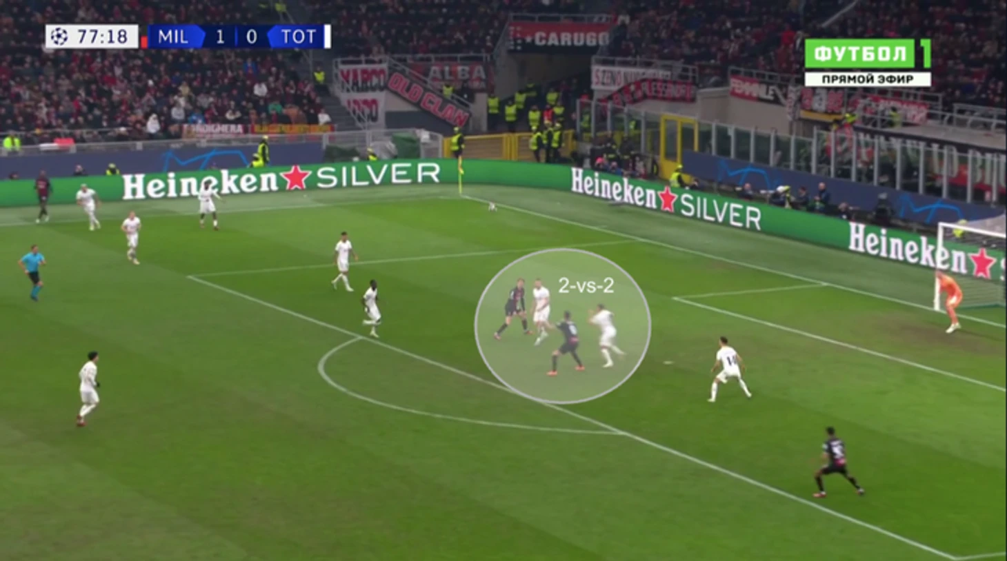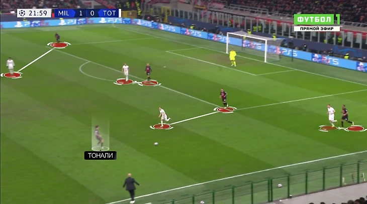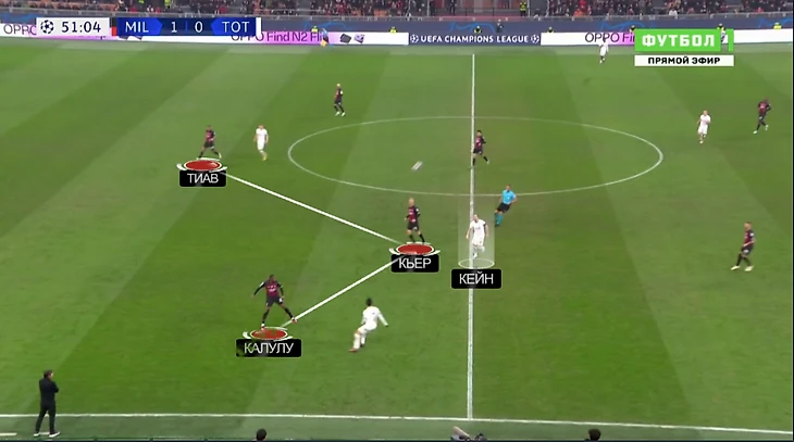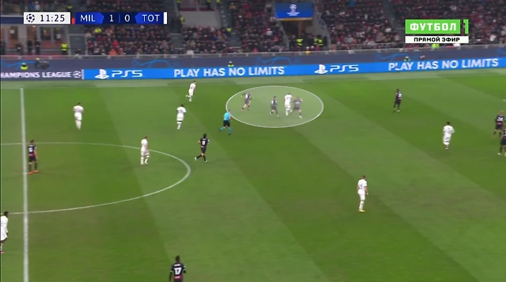 Когда «Тоттенхэм» прессинговал, «Милан» перестраивался с пятерки на четверку защитников. Тео специально оставался ниже Алексиса Салемакерса – помогал за счет техники с выходом в атаку: