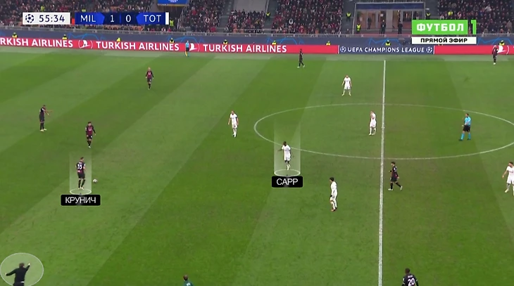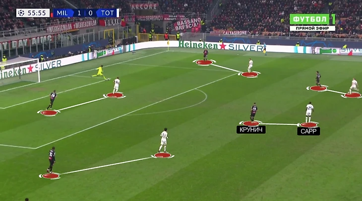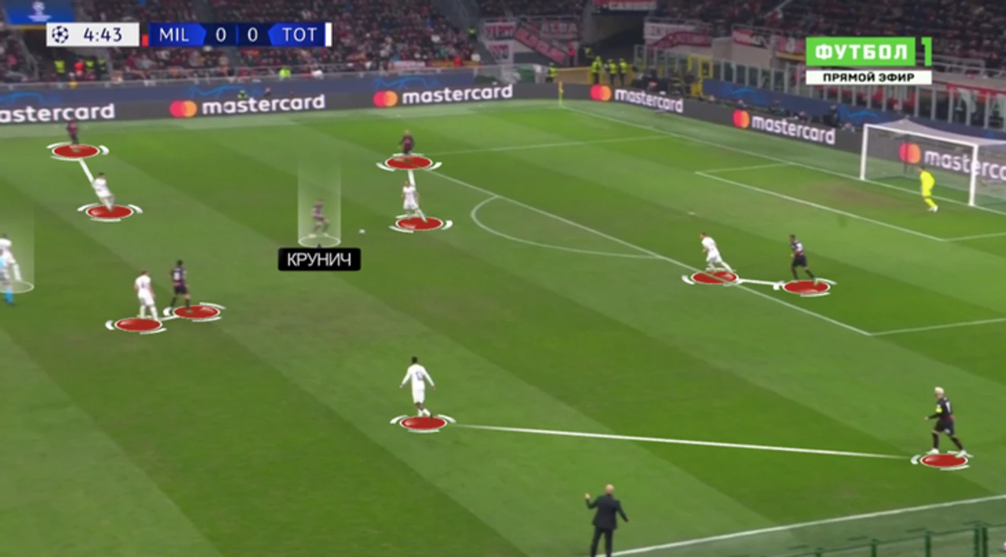 Вот пример из начала матча. Атакующая группа «Тоттенхэма» готова к давлению, а вот опорник Сарр – нет. Из-за этого Раде Крунич получает свободу: