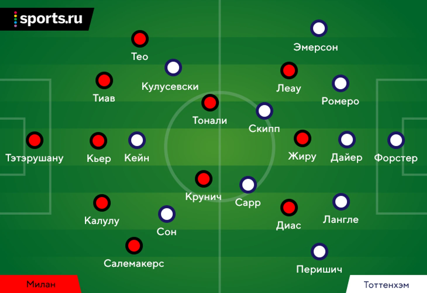На качество игры повлияла не только текущая форма команд, но и потери. Помимо отсутствия основных вратарей, не хватало привычных связей в центре поля. У «Милана» давно вне игры Исмаэль Беннасер, но хотя бы появился Сандро Тонали. «Тоттенхэм» же полностью лишился пары Хейбьерг-Бентанкур. Первый пропускал матч из-за дисквалификации, второй вылетел до конца сезона. Вместо них вышли Сарр и Скипп – резервисты, которые еще и мало играли вместе (92 минуты).