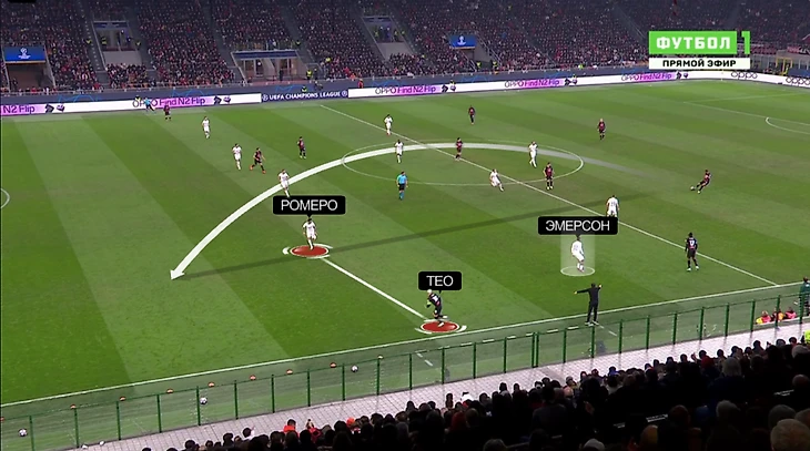 Лучшие моменты «Милана» пришли именно из этой неопределенности. Перед голом Диаса Тео остался на огромном пространстве против Ромеро – без подстраховки аргентинца оставил Эмерсон: