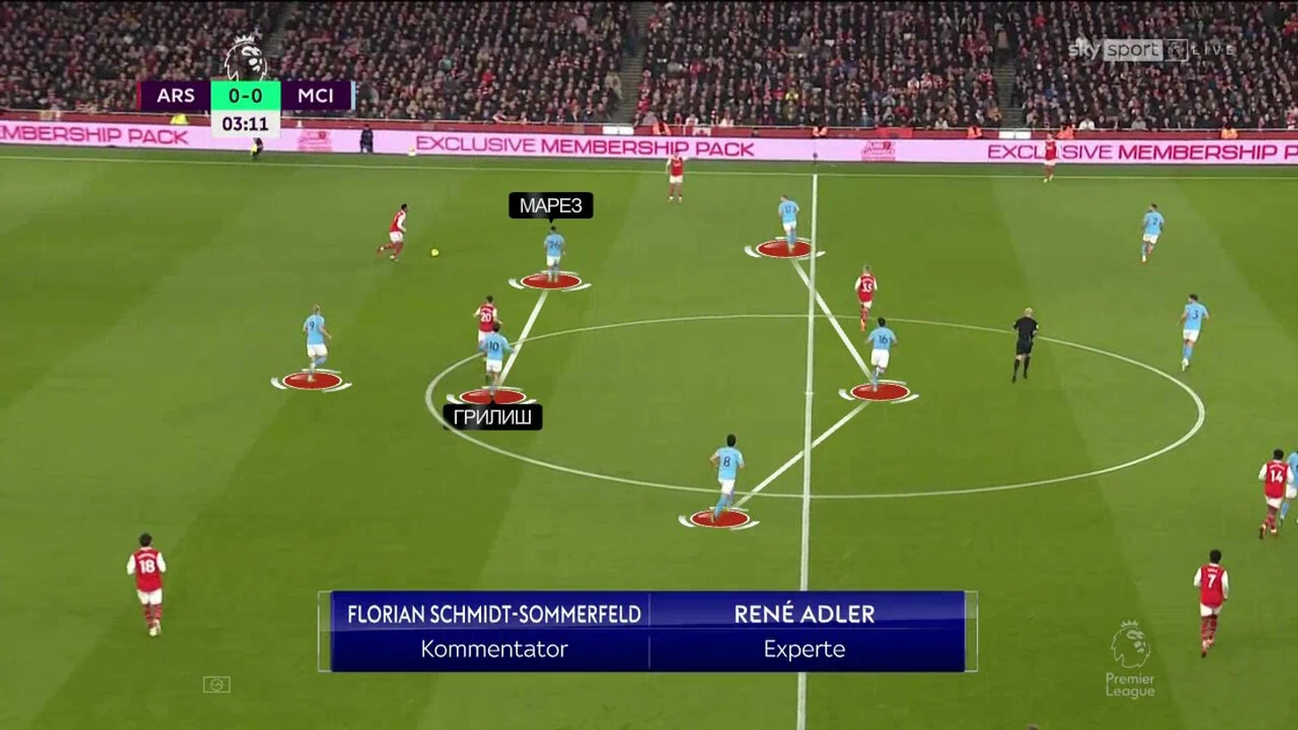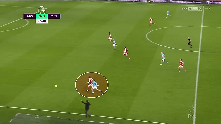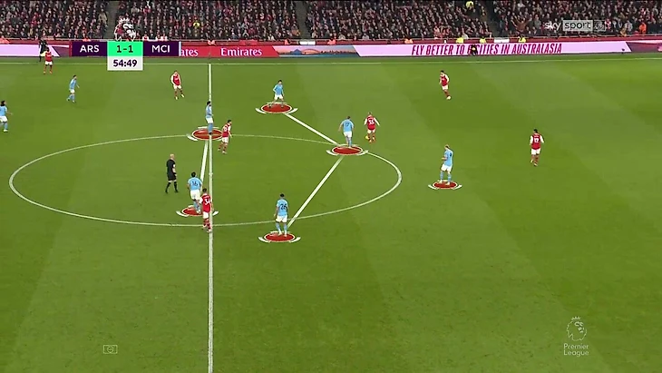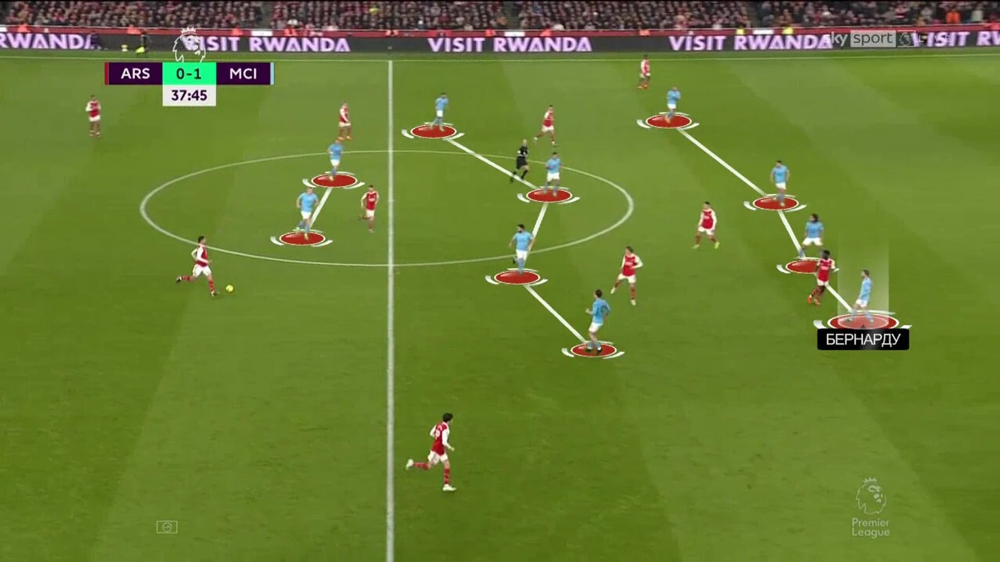 Такая структура перекрывала «Арсеналу» центр, но делала слишком легким продвижение через фланги, где была перспективная дуэль Сака/Бернарду. Еще по ходу первого тайма Пеп вернулся к более классической модели, в которой Де Брюйне поддерживает Холанда, а Грилиш и Марез располагаются на флангах.