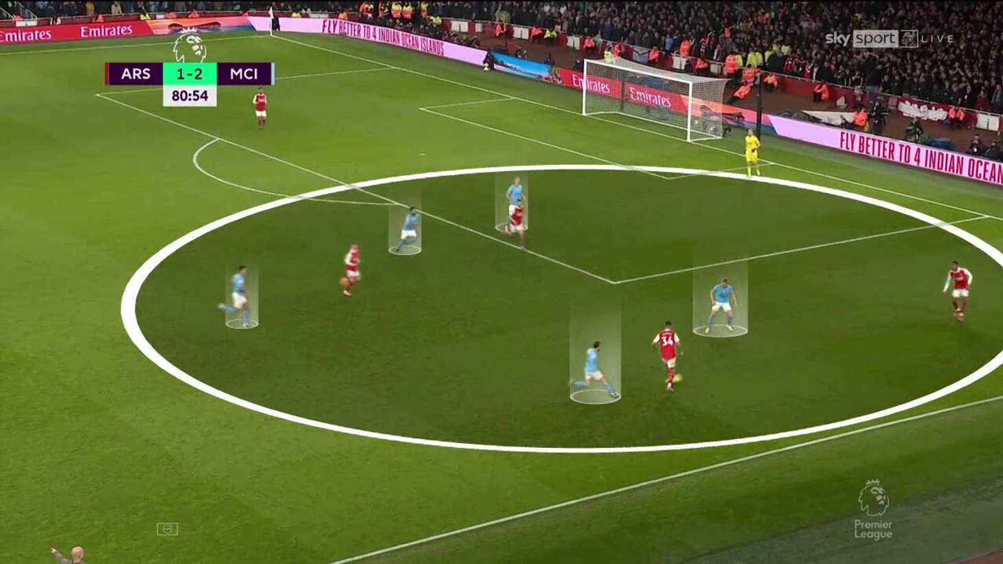 Противоположная сторона оставалась свободной, и команде приходилось много двигаться при смещениях (плюс была потенциальная дыра в случае быстрого перевода), но на практике «Арсенал» выигрывал такие эпизоды за счет интенсивности давления в зоне мяча. Часто «Сити» просто не находил возможности выбраться, сохраняя контроль над атакой – только через безадресные передачи.