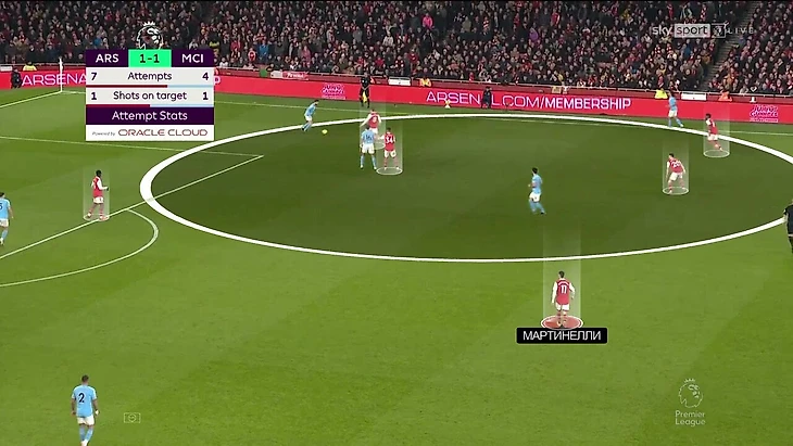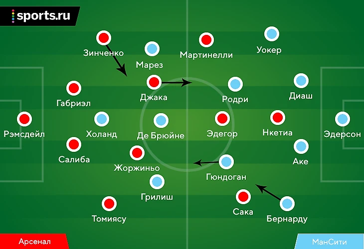 В первой половине «Арсенал» был лучше: заставили Гвардиолу корректировать стартовый план (ниже разберем на конкретных примерах), высоко и без провалов встречали прессингом, ближе подбирались к созданию угрозы в построении атак. Большого перевеса не было, но интереснее смотрелись хозяева.