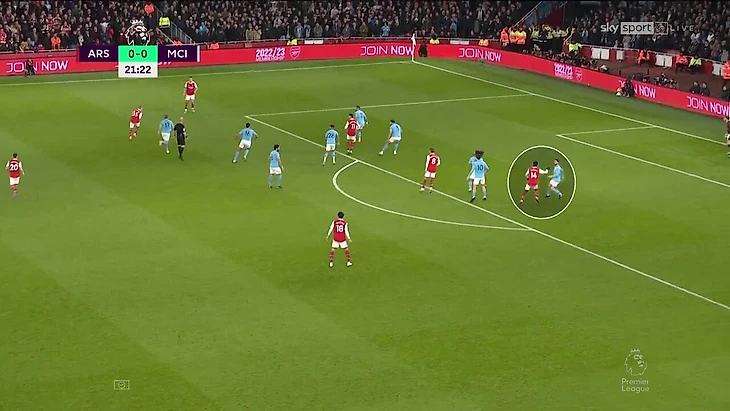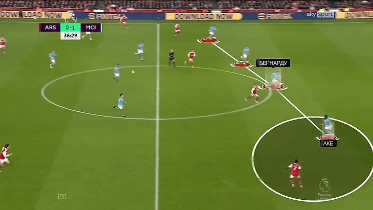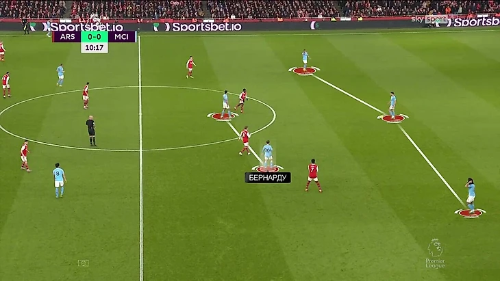 7. И все-таки «Арсенал» пытался проверять Бернарду. В позиционной обороне он достойно справлялся и даже выигрывал у Сака индивидуальные дуэли (в крайнем случае фолил). При прессинге помогала описанная выше фишка со сменой позиции.