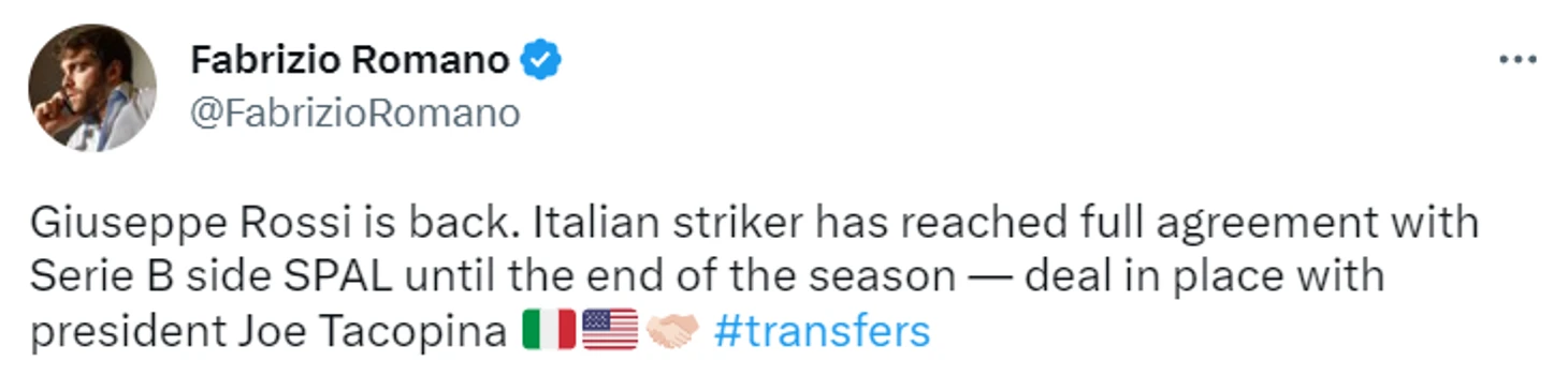 Романо написал следующее: «Джузеппе Росси вернулся. Итальянский нападающий достиг полного соглашения со «СПАЛ» до конца сезона − сделка заключена с президентом Джо Такопиной».