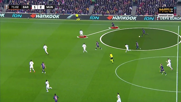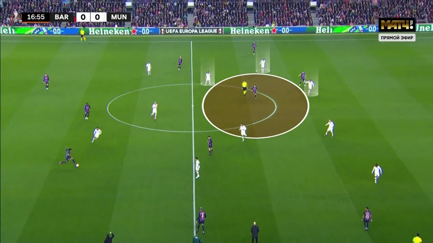 С общим замыслом Тен Хага в этой зоне более-менее понятно, но возникает логичный вопрос: даже плотная и качественная персоналка в центре при использовании трех игроков помогает выключить только трех противников – а что было с Гави?