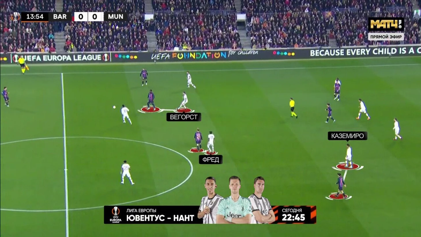 В центральной зоне «Юнайтед» оборонялся через персональные ориентировки. Как правило, Фред – по Френки; Вегорст – по Кессиэ; Каземиро – по Педри: