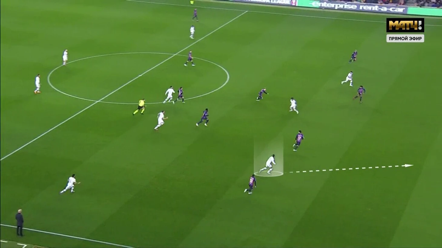 За ширину отвечали Бальде и Рафинья (как и в стартовом рисунке, Альба и Рафинья), но они получали больше поддержки. Все благодаря новым союзникам. Слева Фати отвлекал внимание и помогал делать 2-в-1. Справа Кунде активнее Араухо шел вперед (пускай часто не вдоль бровки, а ближе к центру). Бонусом помогал делавший рывки на оба края Гави: теперь он располагался как десятка – и мог выбирать выгодное направление.