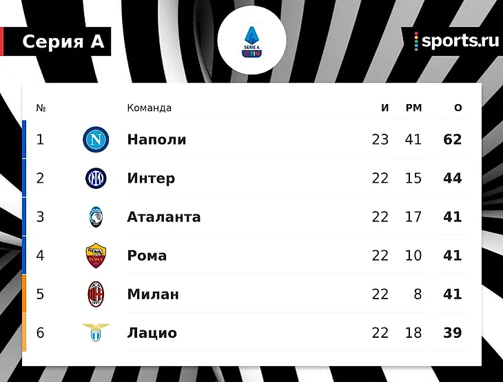 «Наполи» увеличил отрыв от второго места до 18 очков – просто космос. Там «Интер», которому в эти выходные предстоит непростой матч с «Удинезе». «Аталанта», «Милан» и «Рома» отстали уже на 21 очко. В XXI веке в Серии А еще не было команды с таким отрывом к 24 туру (даже близко не подбирались).