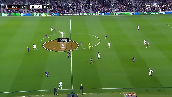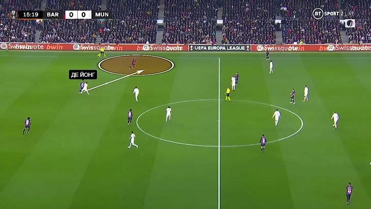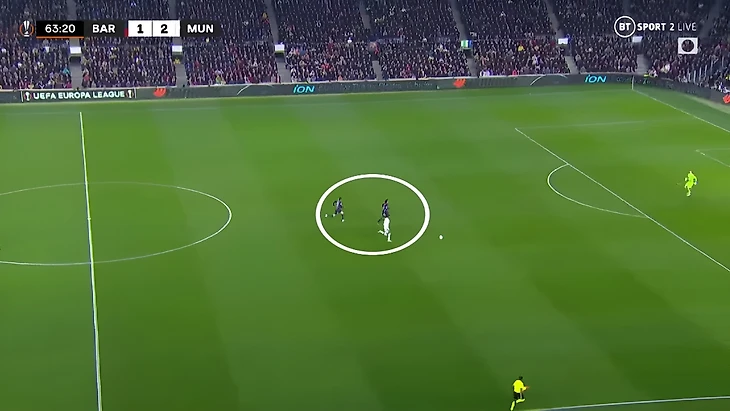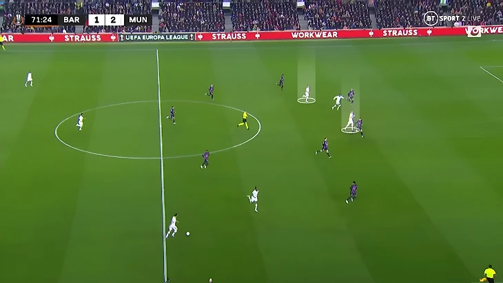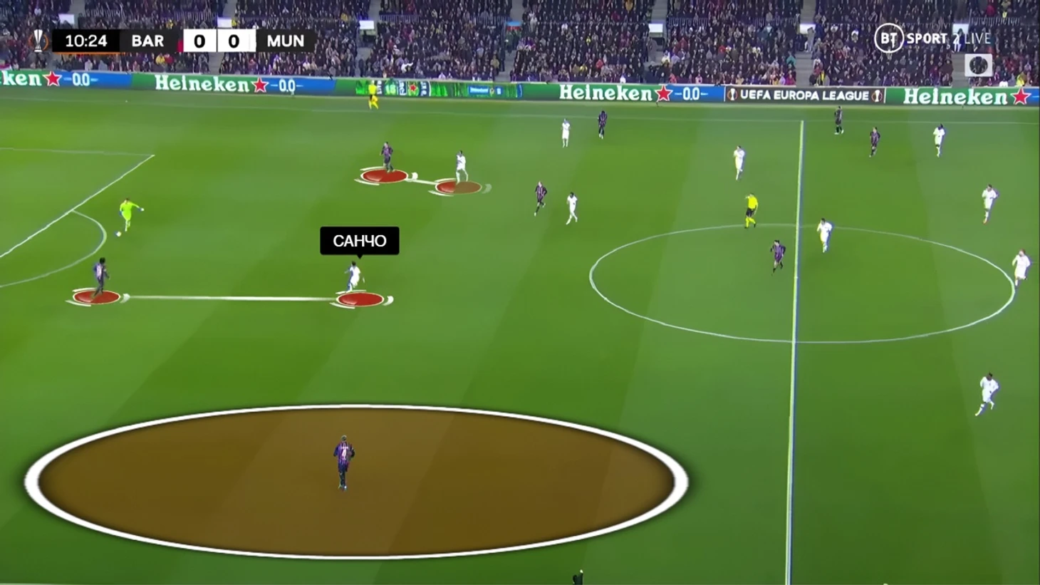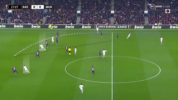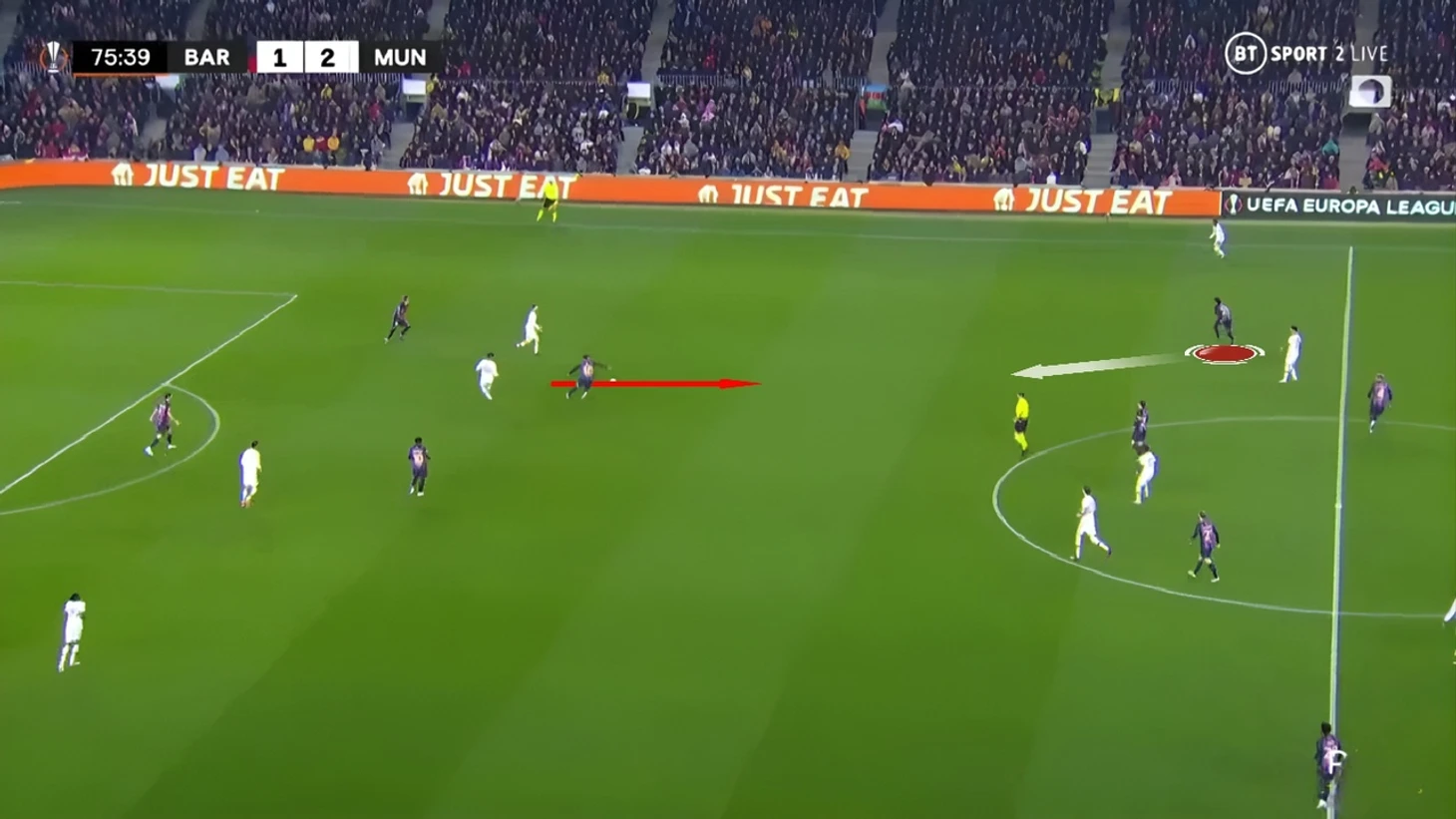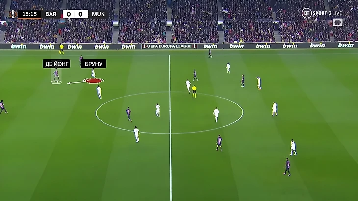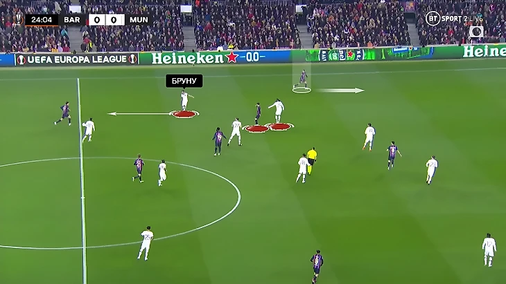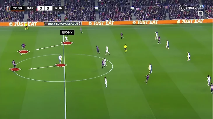 У этого хода были как плюсы, так и минусы. Плюс – «Барселона» лучше удерживала мяч, и этот ход иногда запутывал «Юнайтед». Например, в этом эпизоде Бруну агрессивно пошёл на Френки, но был отыгран, благодаря чему «Барса» смогла выйти в перспективную атаку: