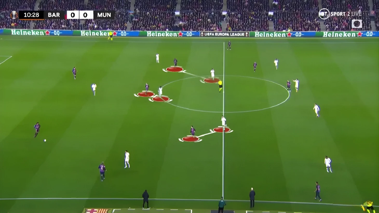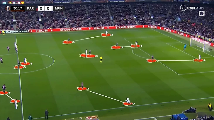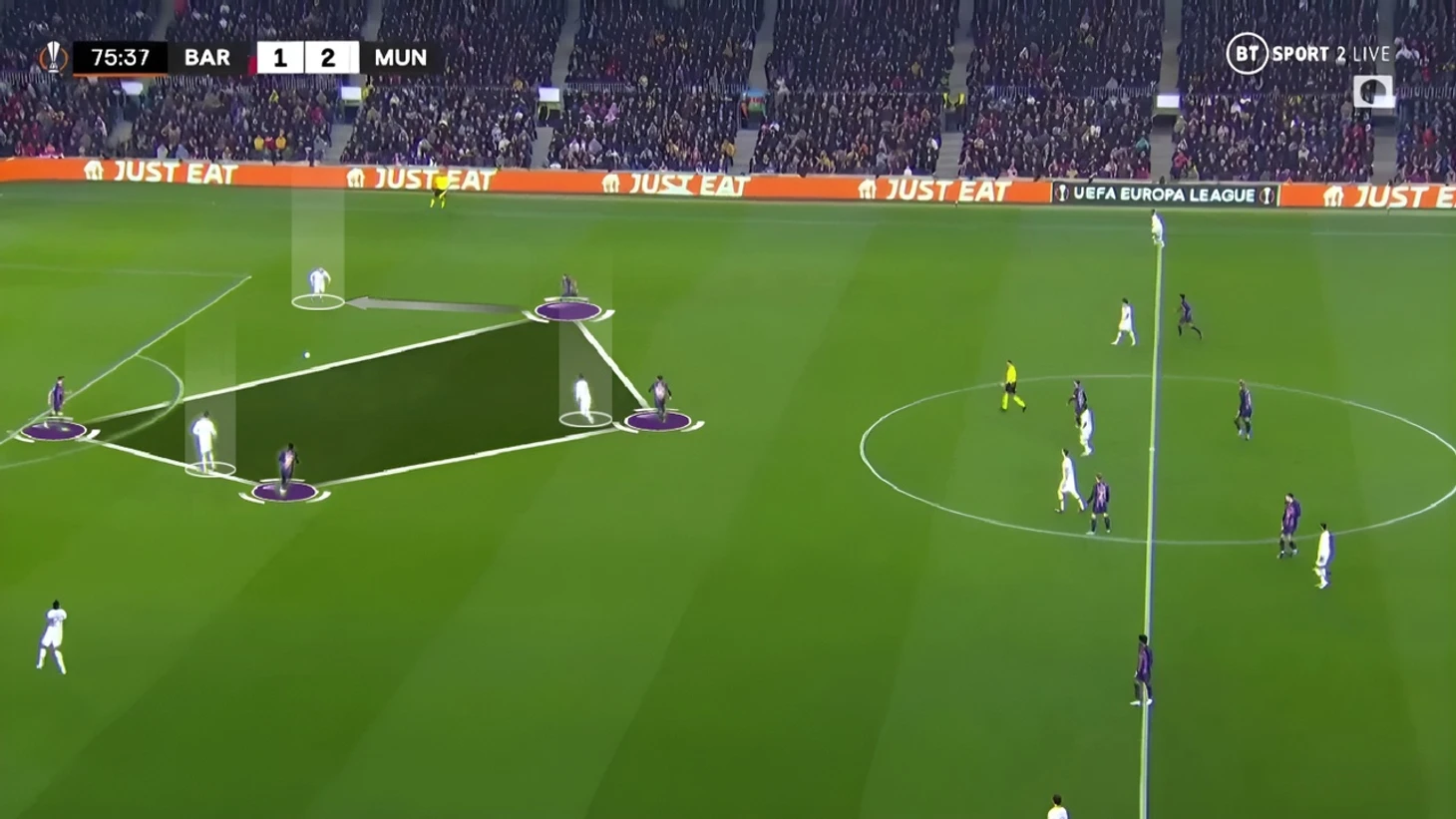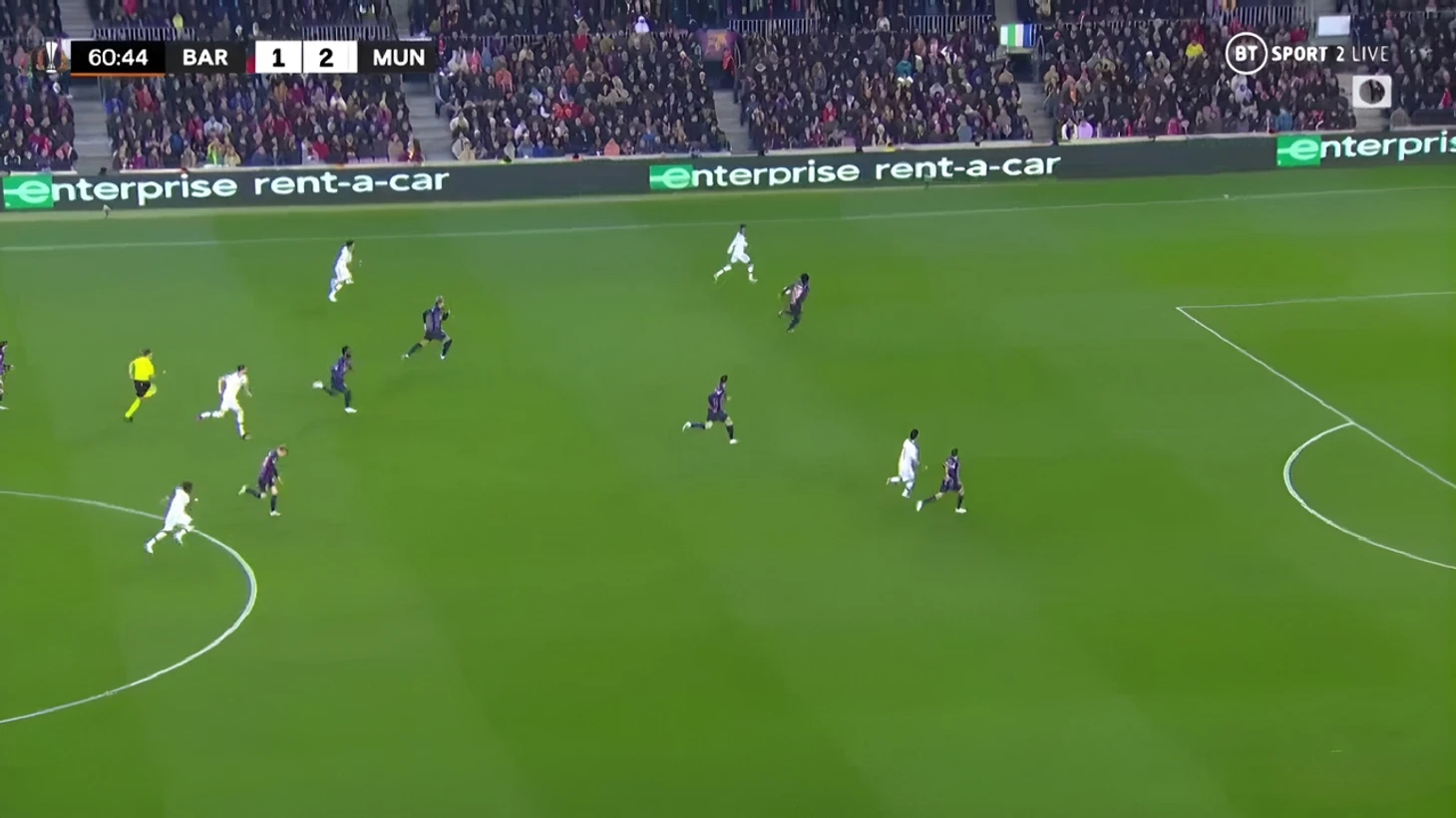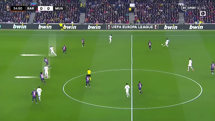 У этого хода были как плюсы, так и минусы. Плюс – «Барселона» лучше удерживала мяч, и этот ход иногда запутывал «Юнайтед». Например, в этом эпизоде Бруну агрессивно пошёл на Френки, но был отыгран, благодаря чему «Барса» смогла выйти в перспективную атаку: