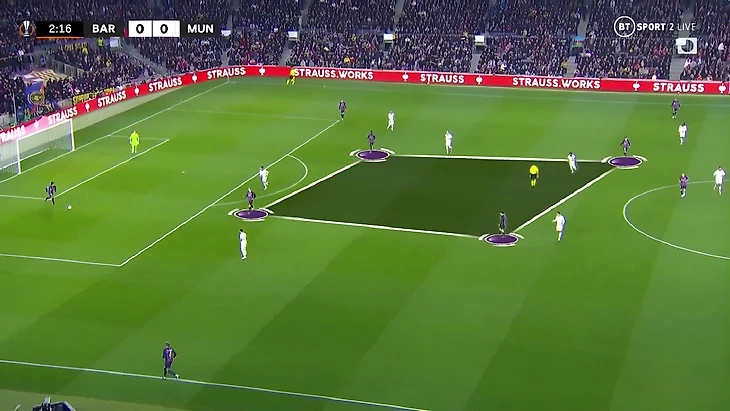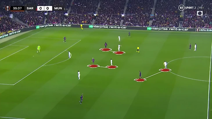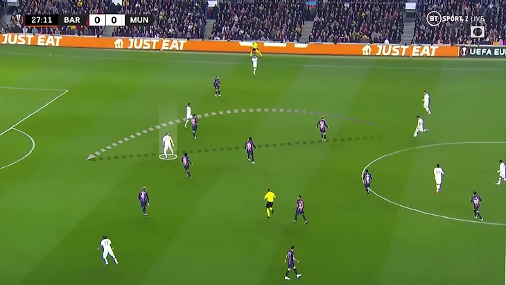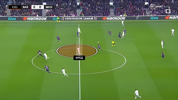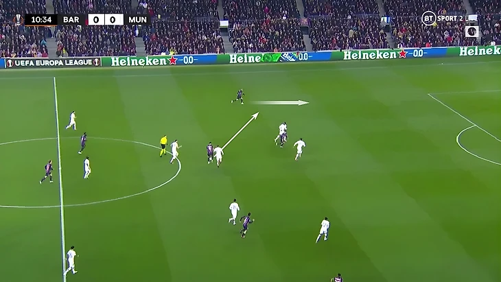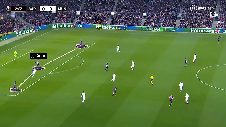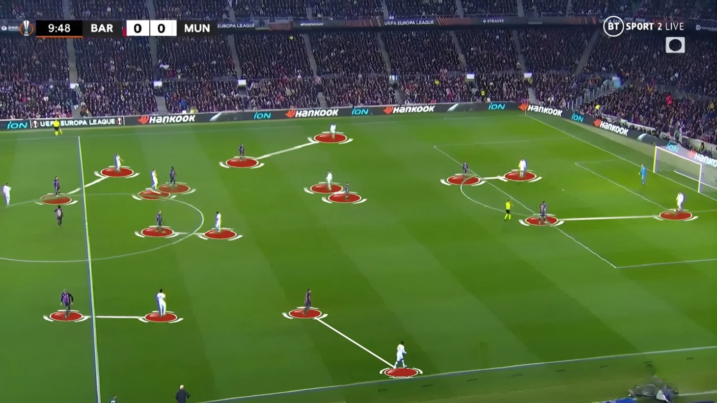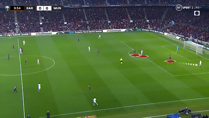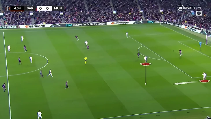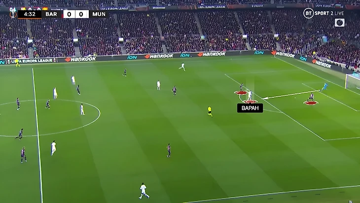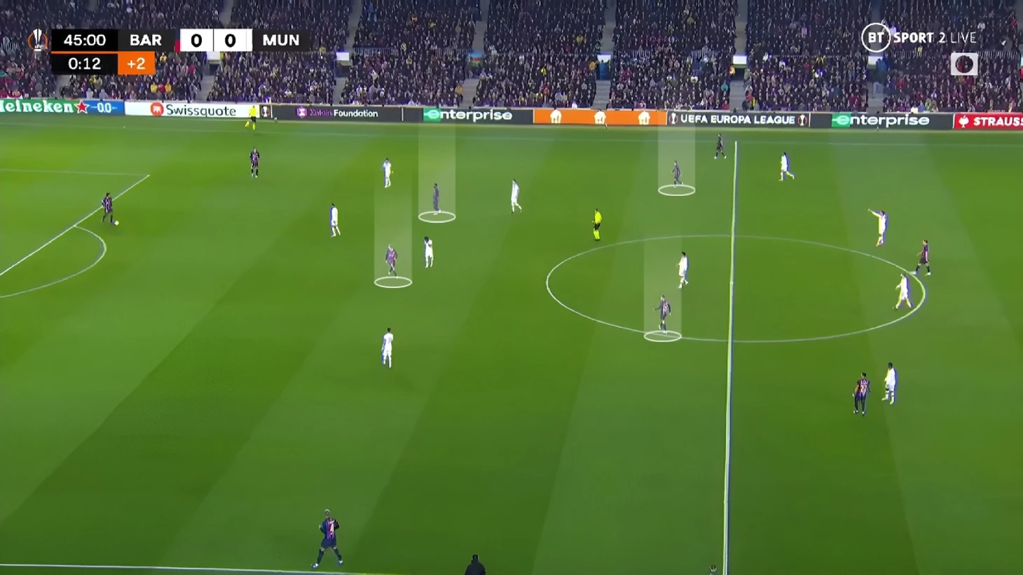 У этого хода были как плюсы, так и минусы. Плюс – «Барселона» лучше удерживала мяч, и этот ход иногда запутывал «Юнайтед». Например, в этом эпизоде Бруну агрессивно пошёл на Френки, но был отыгран, благодаря чему «Барса» смогла выйти в перспективную атаку: