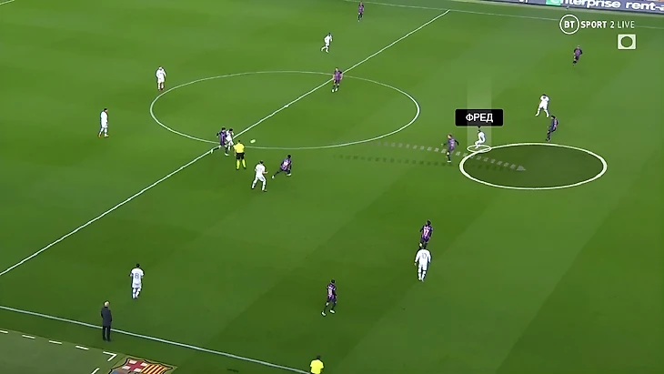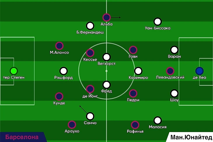 Сюрпризы начинаются в центре поля – нейтрализовать самую сильную (даже без Бускетса) зону «Барселоны» тен Хаг попытался с помощью персональных ориентировок при давлении: Фред играл по де Йонгу, Вегхорст по Кессье и Каземиро по Педри (Роберто):