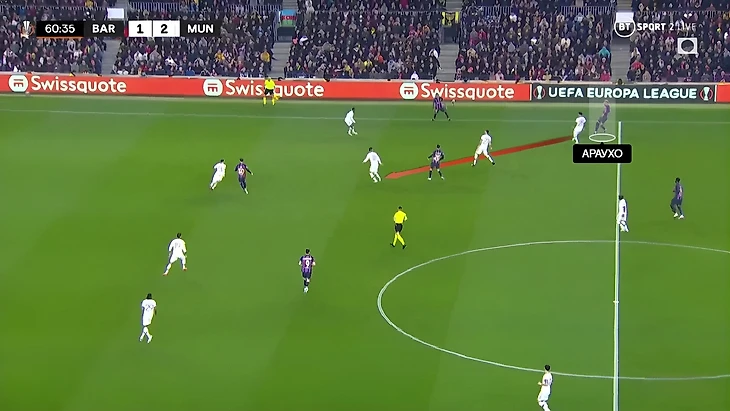 По сути, главная задача «каталонцев» заключалась в доставке мяча в эту зону. Хоть и с периодическим успехом, но это удавалось делать. Здесь Араухо делает перевод на Альбу, который свободен из-за того, что Уан-Биссака играет по Гави:
