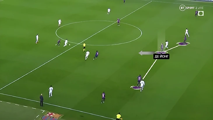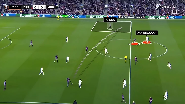Из-за того, что Бруну в прессинге был ориентирован на центрального защитника, а Альба традиционно активно подключался в атаку, слева у «Барселоны» часто возникала ситуация 2-в-1:
