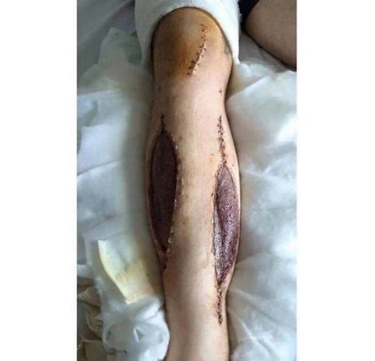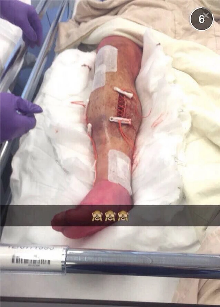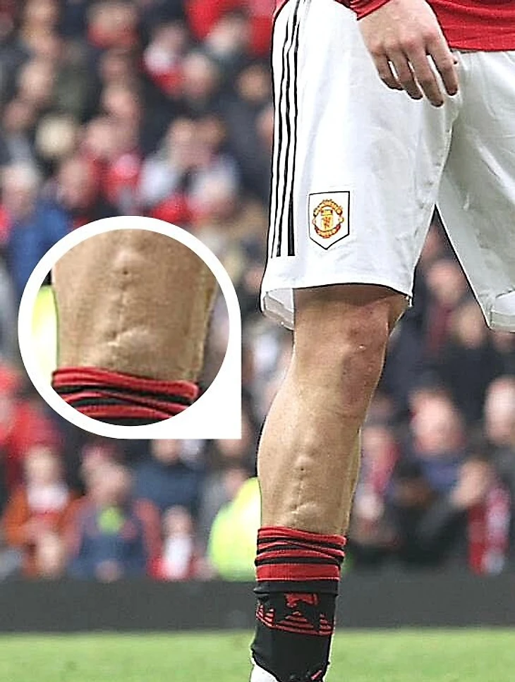 О той травме напоминает шрам на ноге футболиста, который недавно попал в объектив камеры из-за приспущенной гетры.