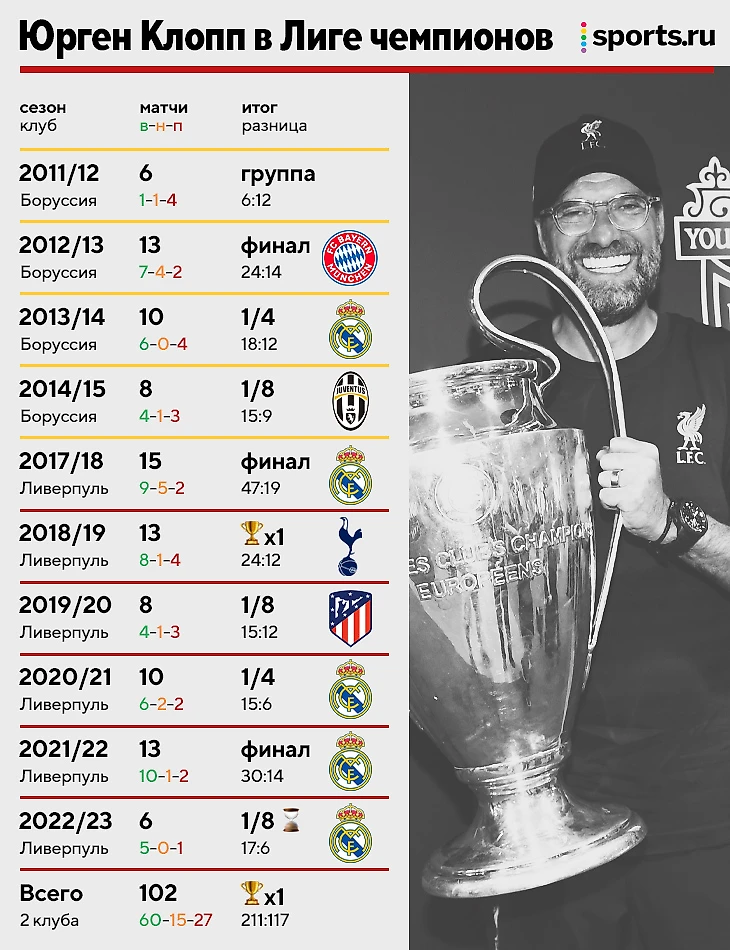 С учетом квалификации (играл в сезоне-2017/18 против «Хоффенхайма») у Клоппа 102 матча в ЛЧ – вот его путь.