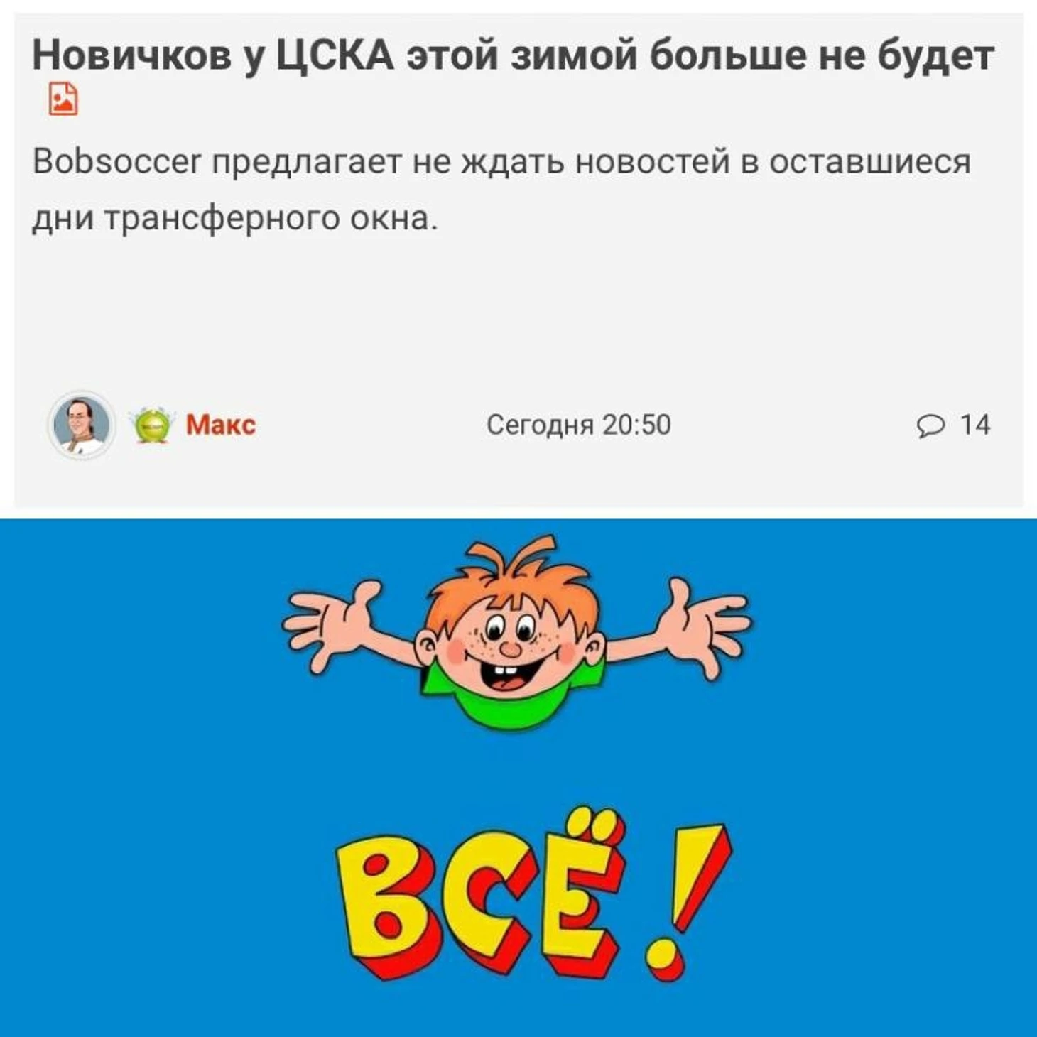 Когда наступают последние дни летней заявочной или зимней дозаявочной кампании, наблюдается одна и та же картина. Читатели то и дело пишут на ветках эксперта Bobsoccer, что тот держит интригу до самого конца, до последних минут, чтобы, как говорится, набили больше кликов. Так вот, друзья. Призываю расслабиться уже сейчас, хотя до закрытия зимнего трансферного окна на данный момент остается более двух суток. По данным Bobsoccer, новичков в ЦСКА до возобновления сезона 2022/23 больше не будет. Илья Агапов, который так и не сыграл ни одной минуты на всех зимних сборах и наверняка пропустит кубковые матчи с "Краснодаром", так и останется единственным приобретением. На выход, напомню, у армейцев Бруно Фукс, Адольфо Гайч и Владислав Яковлев. Все отправились в аренду. Поэтому не обновляйте порталы в ожидании трансферных новостей. Принимаем информацию к сведению и готовимся к ближайшим официальным матчам. Варианты были, о некоторых сообщалось в СМИ (отметим, что не вся информация, которую вбрасывали, была верной). Послезавтра днем у ЦСКА предыгровая тренировка в Москве. В четверг игра с "Краснодаром". Начало в 17.30 по московскому времени.