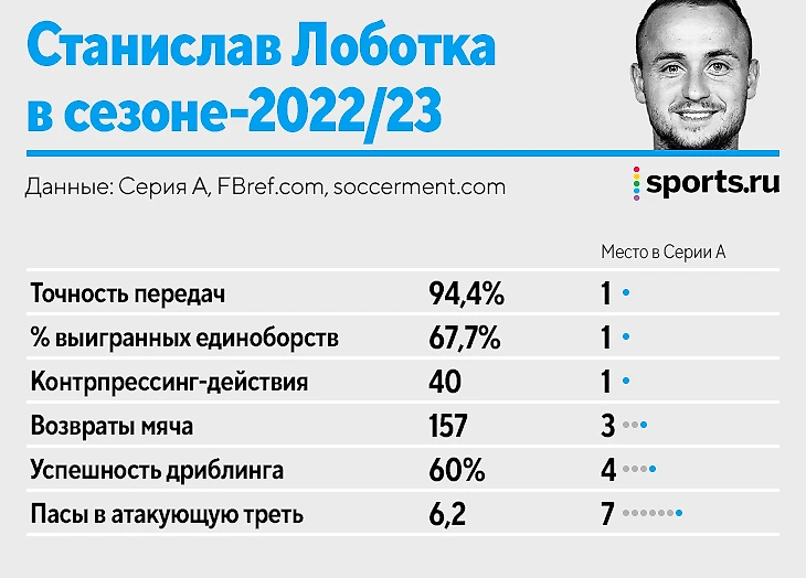 Поэтому Лоботка – самый важный и незаменимый игрок «Наполи». Неаполитанцы побеждали без Осимхена, обходились без Ангисса и Хвичи, наверняка справятся и без Ди Лоренцо, но Ким и особенно Станислав необходимы. Словак определяет игру во всех фазах. С мячом он – лидер Серии А по точности передач, 4-й по качеству дриблингу и 7-й по пасам в атакующую треть. Без мяча – лучший в лиге по контрпрессингу и качеству единоборств.