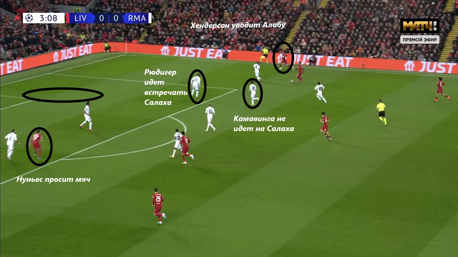 Фантомной вспышкой из недалекого прошлого стал и первый гол, когда Салах наградил Нуньеса ювелирной передачей. Рюдигер выдернулся на египтянина, оголил пространство за спиной, а Милитао, изначально контролировавший движение Дарвина, не отреагировал на его рывок. Зевнул и Карвахаль, который мог увязаться за уругвайцем. Похоже, Эдер старался выдержать линию офсайда в ожидании возможного паса на Хендерсона. Камавинга также не оценил важность эпизода, хотя мог выдвинуться навстречу Салаху.