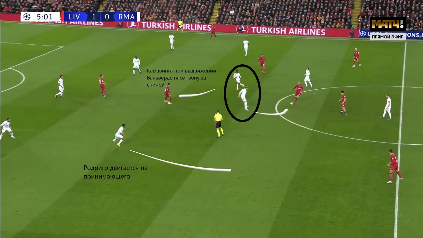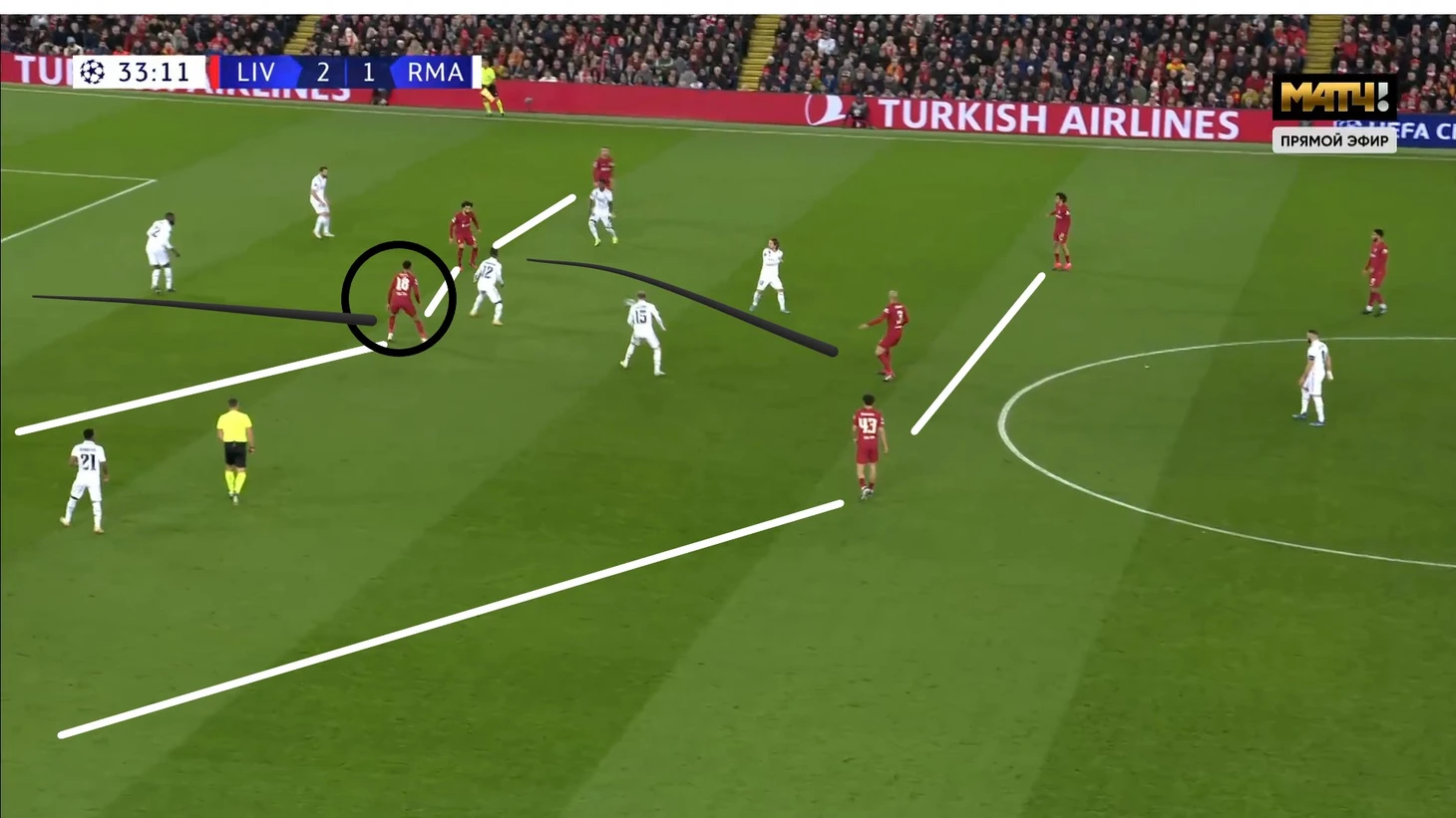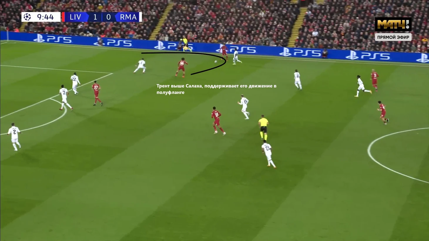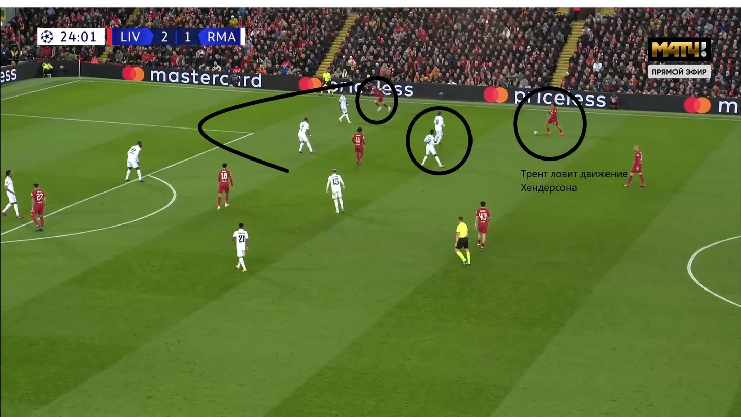 Модрич и Камавинга стали дисциплинированнее помогать левому флангу, где Салаха поддерживали Хендо и Трент. Активный край, который в любой другой день стал бы ключиком к победе, создавал значительные проблемы для «Реала». Именно отсюда пришла еще одна угроза, чудом не закончившаяся голом. Тренту подарили время и пространство - он молниеносно отправил в забег Хендо.