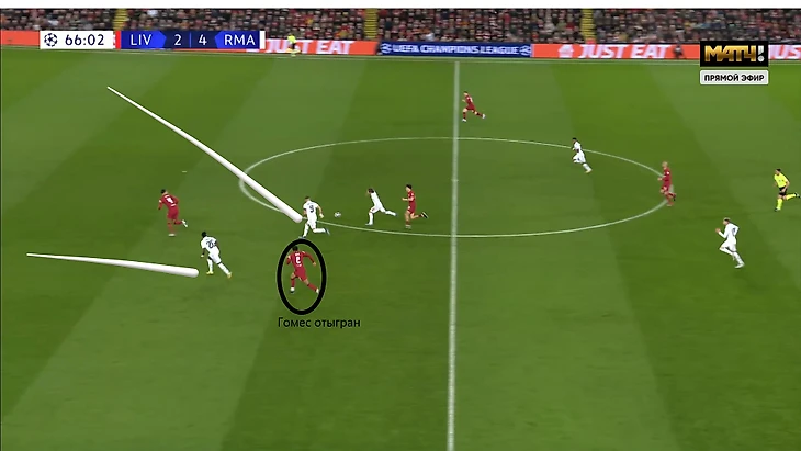 «Реал» оборонялся в 4-5-1 с активным выдвижением кого-то из центрхавов на принимающего. На троих у них 9 отборов и 5 перехватов. После 2-го гола имени Куртуа «Ливерпуль» отзеркалил формацию «сливочных», но перегруз фланга Трента дал свои плоды: Давид Алаба в сверхвысокой позиции поддерживал Винисиуса, Бензема моментально отклеился от Гомеса, сдвинулся к партнерам и сразу же отметился ассистом. Вини вошел в штрафную и исполнил обводящий как раз таки из-под Гомеса, кошмарный вечер для которого только начинался.
