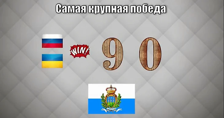 Вы возможно удивитесь, но самые крупные победы Россия с Украиной одержали над одной и той же сборной с одним и тем же счётом 9:0. Досталось бедной Сан-Марино. В 13 году их уничтожили украинцы, а в 19-ом россияне, Дзюба кстати тогда положил покер.