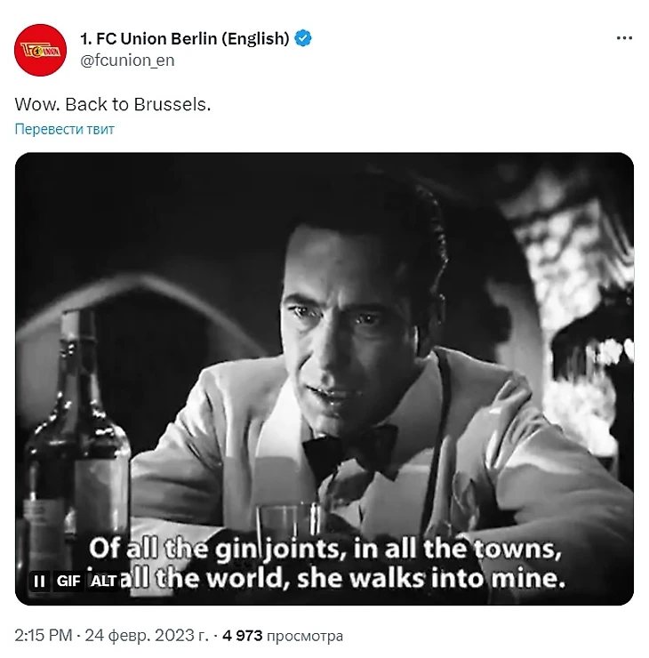 «Унион» написал «Вау, снова в Брюссель». И подкрепил это гифкой с киноцитатой из «Касабланки»: «Из всех баров во всех городах мира она заходит именно в мой».