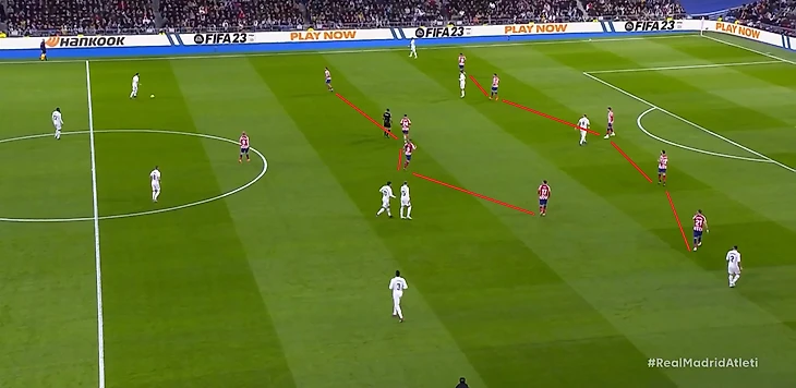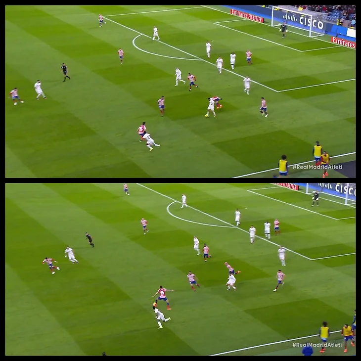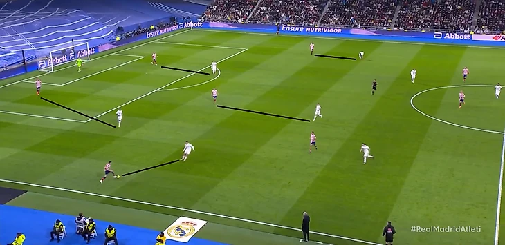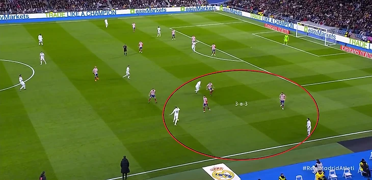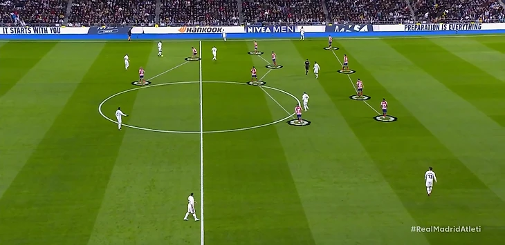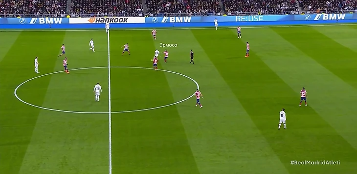 «Атлетико» удалось нейтрализовать оба фланга соперников. «Реал» перегружал правый фланг тремя игроками, но команда справлялась за счет четких ориентировок. Асенсио держал Эрмосо, по Вальверде играл Сауль, а по создающему ширину Карвахалю-Карраско.
