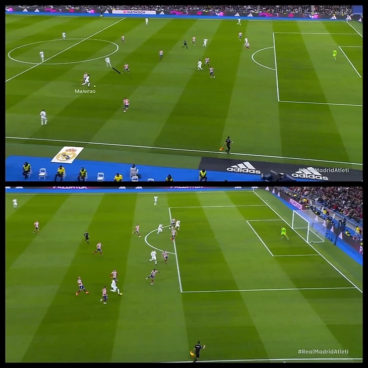 На начальном отрезке команда Анчелотти начинала атаки через подключения Милитао. Один из лучших моментов тайма создал именно он. На 11-й минуте бразилец воспользовался позицией Сауля (он ждал пас в центр) и протащил мяч в правом полуфланге, после чего прострелил на дальнюю штангу. После изменения схемы «Атлетико», у него больше не было столько пространства для рывков.