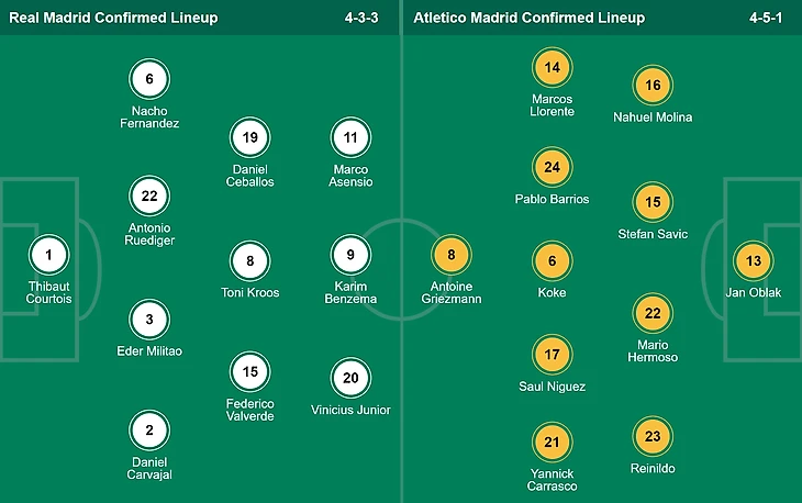 Карло Анчелотти произвел 4 замены в составе по сравнению с игрой в ЛЧ: вместо травмированных Алабы и Родриго на поле вышли Начо и Асенсио. Состав полузащиты также изменился- Кроос и Себальос начали матч с первых минут.
