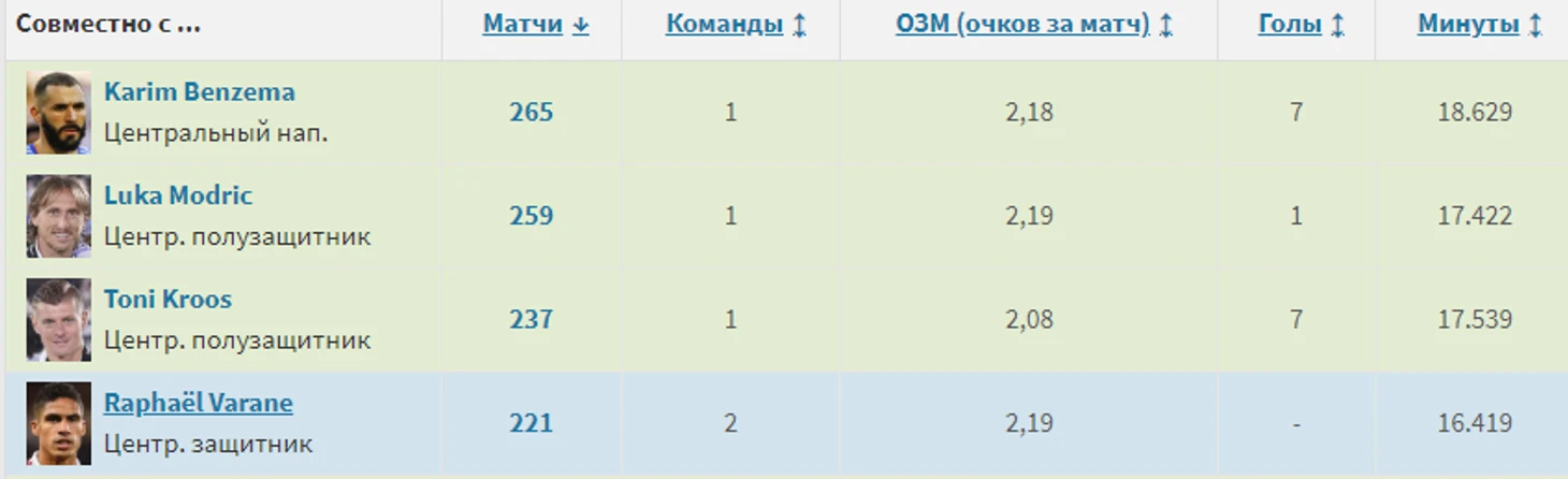 По данным Transfermarkt, защитник Рафаэль Варан и хавбек Каземиро провели бок о бок целый 221 матч. Вместе они играли за «Мадрид», а теперь защищают цвета «Юнайтед». Француз переехал в Манчестер в августе 2021 года, а бразилец − в августе 2022 года.