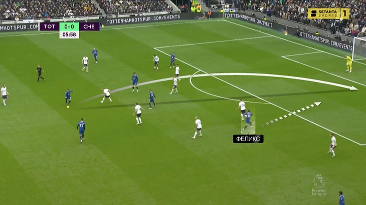 В дерби была попытка придумать что-то новое. На этот раз Поттер представил вариант с мультидесятками. Вот в чем был идея: опорную «Тоттенхэма» перегружали несколько игроков – между линиями открывался не только Феликс (его типичный прием), но и другие партнеры. Иногда – по трое-четверо, причем в разных вариациях: