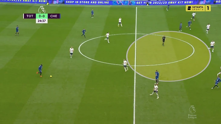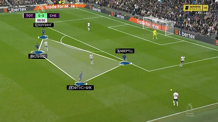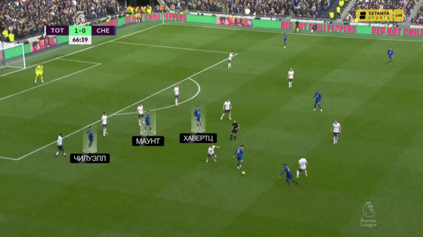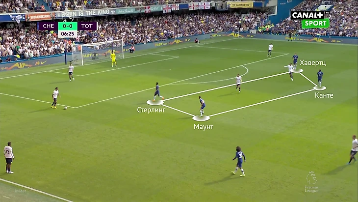 В игре первого круга Томас Тухель выбрал интересный вариант прессинга под «Тоттенхэм». Тогда в давлении участвовала четверка из Рахима Стерлинга, Кая Хавертца, Нголо Канте и Мэйсона Маунта. Разбивались по парам: Стерлинг и Хавертц действовали повыше и начинали прессинг, а Канте и Маунт замыкали его.
