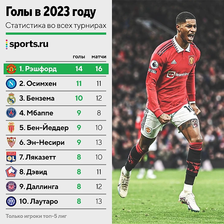 • Маркус обгоняет не только топ-форвардов вроде Бензема, Мбаппе и Осимхена, но и целые команды. У «Ливерпуля» (11) и «Челси» (4) в 2023-м меньше забитых, чем у Рэшфорда.