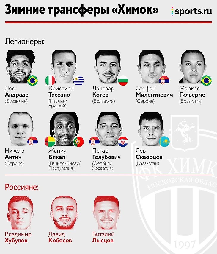 В прошедшее зимнее трансферное окно состав «Химок» пополнили 12 игроков. Российский паспорт имеют лишь трое из них – Владимир Хубулов, Давид Кобесов и Виталий Лысцов.