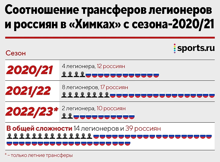 Мы посчитали количество трансферов легионеров и российских игроков у подмосковного клуба с 2020-го. Терюшков, который в теории мог влиять на трансферную политику подмосковного клуба, покинул должность члена наблюдательного совета «Химок» в октябре 2022-го, поэтому зимнюю трансферную кампанию клуба мы учитывать не стали.