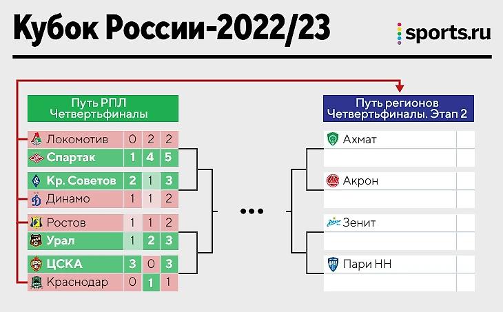 До этого «Спартак» оказался сильнее «Локо», а «Урал» выбил «Ростов». Проигравшие вылетели только из верхней части, но не из Кубка России-2022/23 вообще.