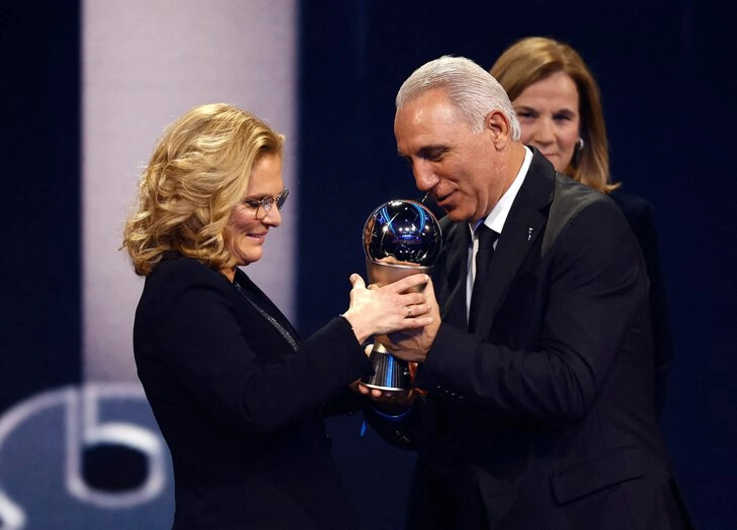 А вот Христо Стоичков вручает приз лучшей женщине-тренеру – Сарине Вигман.