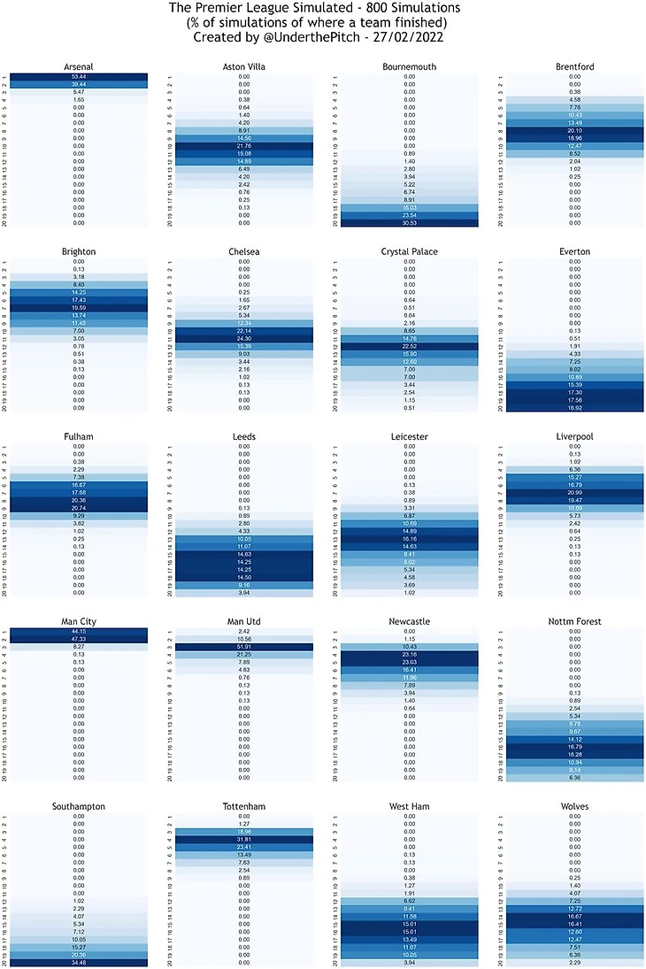 Журналист Крейг Эдвардс провел 800 симуляций оставшихся туров АПЛ, чтобы попытаться предсказать итоговые позиции всех клубов высшего дивизиона.