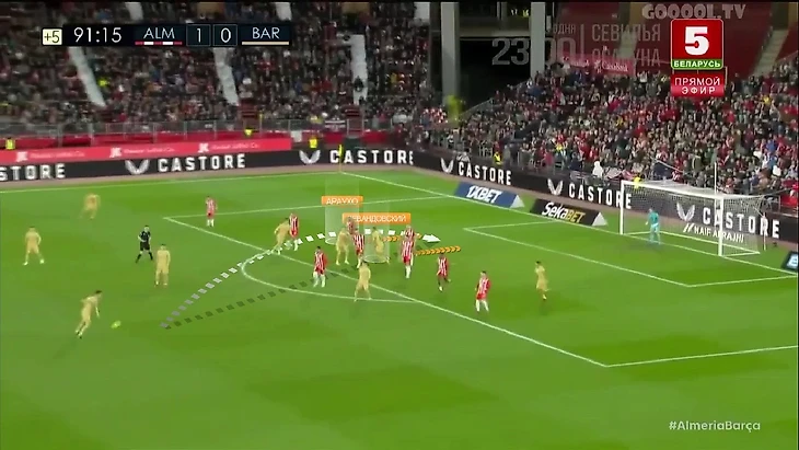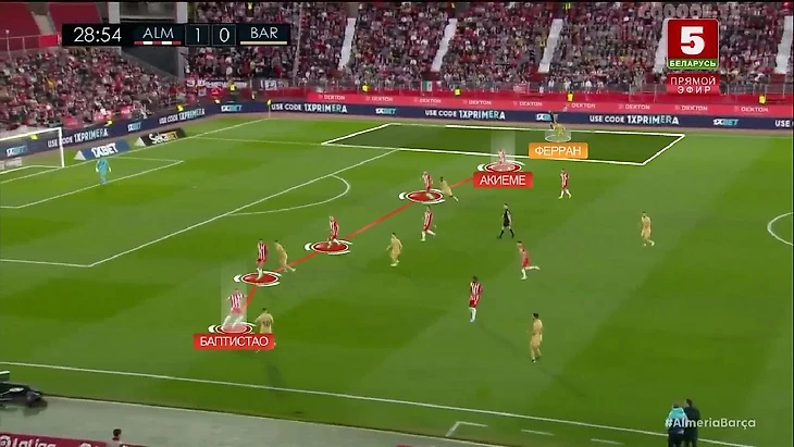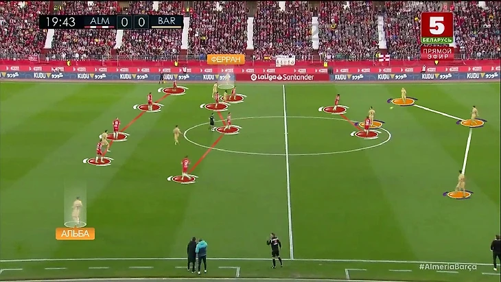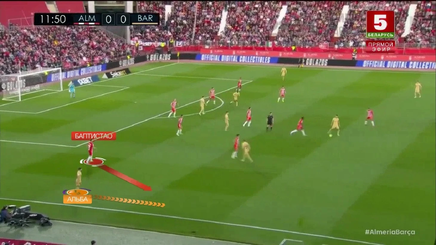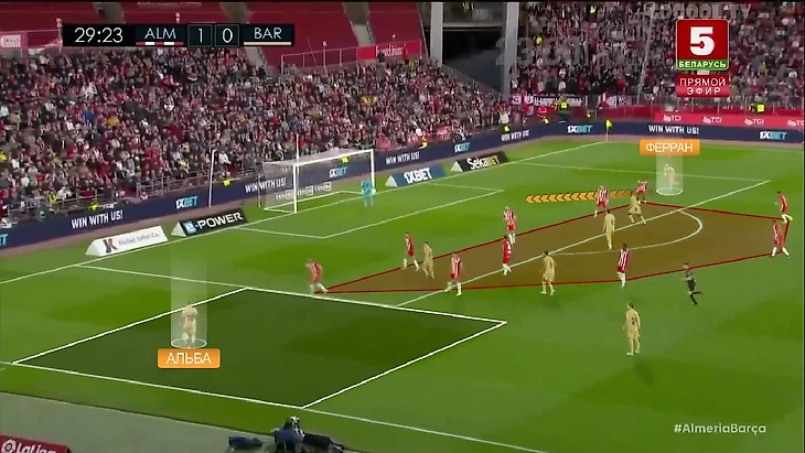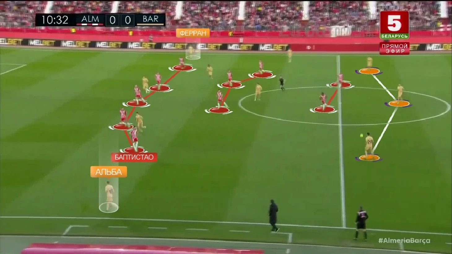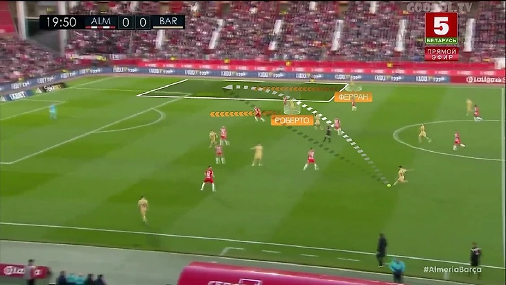 Это было важным составляющим, потому что в предыдущем туре против «Кадиса» (2:0) Ферран провёл просто блистательный матч в роли вингера под изоляции и его постоянно «кормили» переводами с противоположного фланга. «Альмерия» неплохо контролировала «Барсу» в этом компоненте, но в низком блоке совсем избежать потенциально опасных ситуаций не получилось.