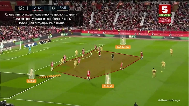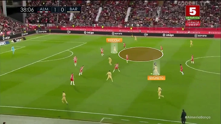 А это пример не очень хорошего использования пространства на флангах: «Альмерия» снова очень плотно обороняется в центре. Справа ситуативно оказавшийся там Бускетс (!) хорошо выдерживает ширину, слева там формально располагается Гави, но на самом деле он двигается из этой зоны и ширину уже никто не держит:
