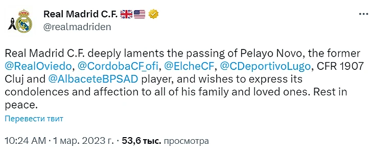 В соцсети Пелайо стекаются люди. Его посты почти не комментировались, теперь там на трагедию реагируют сотни людей. Хихонский «Спортинг», «Альбасете», «Овьедо» и другие клубы выразили соболезнования. Отреагировал с ними и мадридский «Реал».