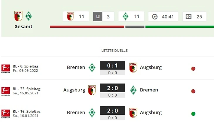"Вердер" для "Аугсбурга" является любимым соперником. "Фуггеры" одиннадцать раз обыгрывали "музыкантов" (больше, чем кого-либо ещё на уровне Бундеслиги; в том числе было одержаны победы в трёх из четырёх предыдущих игр), поразили их ворота 36 раз (опять же, так много больше никому не забивали)