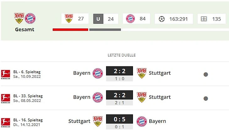 У "Баварии" десять подряд побед в Бундеслиге в Штутгарте (а с учётом Кубка эта серия достигла 12 матчей). А вот два предыдущих матча в Мюнхене завершались вничью (оба раза 2:2)