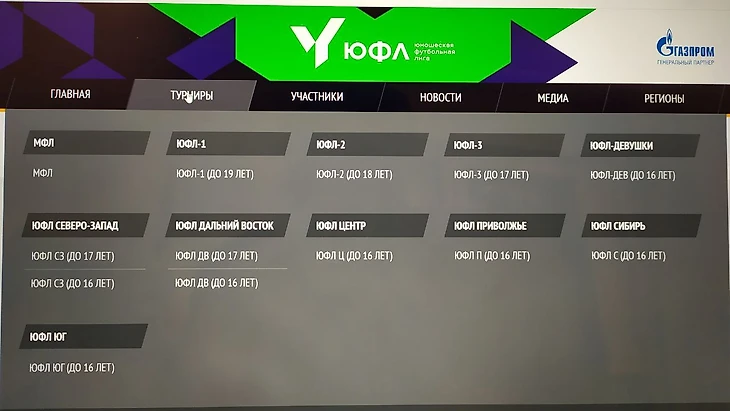 Вот так выглядит вся структура ЮФЛ, первая строчка, наверное, понятна, это вершина айсберга, МФЛ - это ветераны среди молодежи, которым уже пора в профессионалы, остальные - лучшие по возрастным категориям, в этих дивизионах можно сказать? представлена только элита нашего футбола.